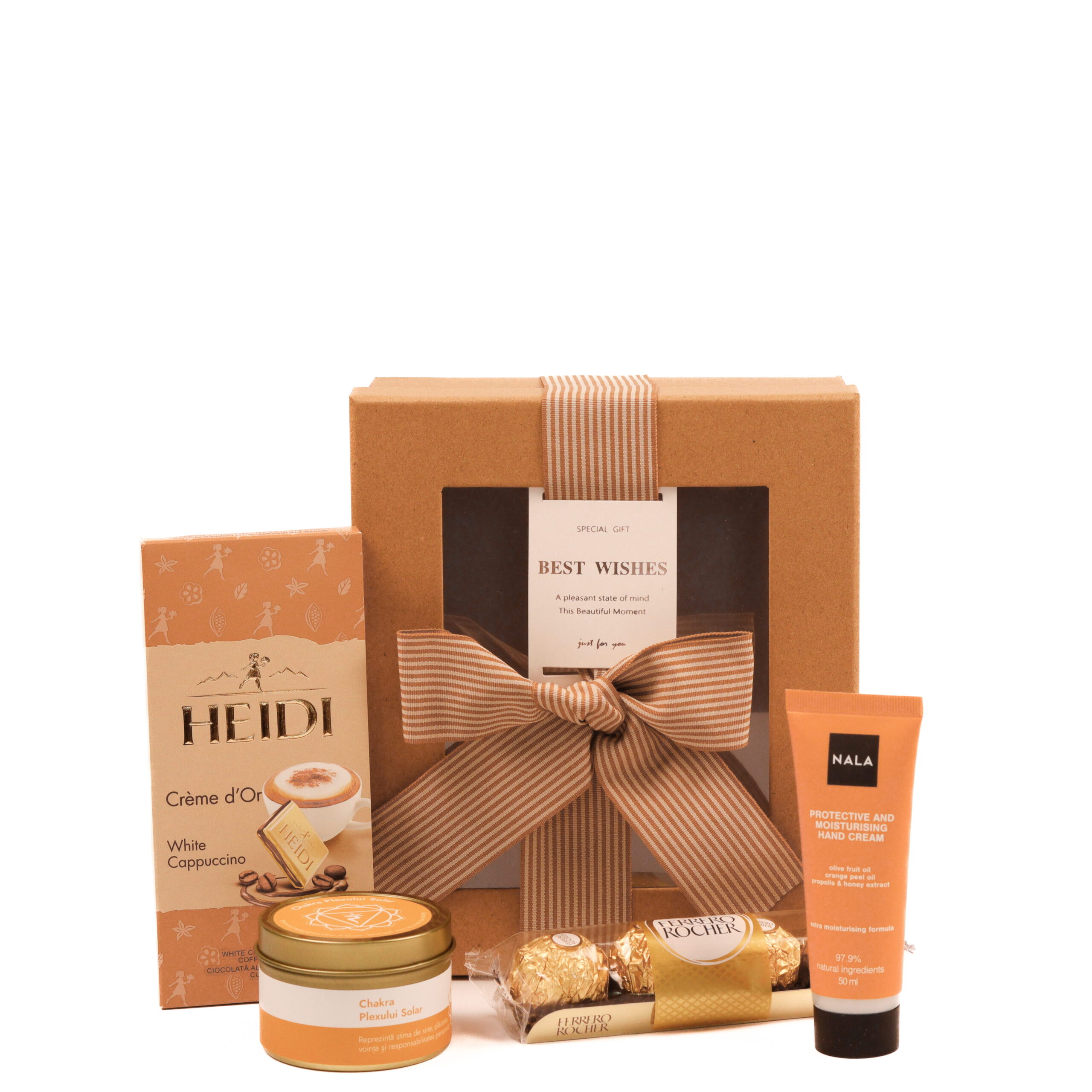 Cadou delicat Extravaganza cu ciocolată premium, cremă de mâini și bomboane fine, lumanare parfumata în cutie elegantă cu fereastră