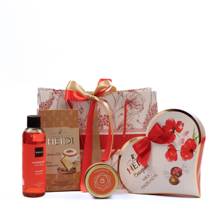 Combinația dintre dulciuri fine și produse de îngrijire personală oferă o experiență echilibrată, cu un impact vizual plăcut și o prezentare îngrijită.